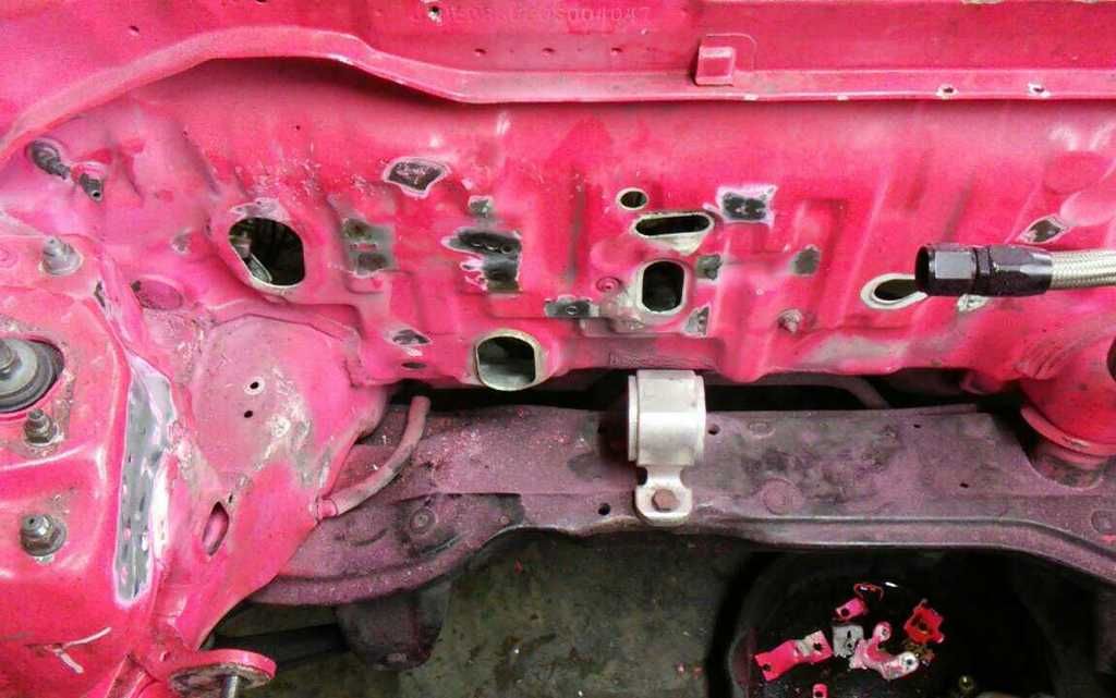 took off all the knuckle busting brackets on the firewall, as well as brake lines for a ghetto tuck. the brake lines and prop valve were all fucked up and hit the charge piping anyway.