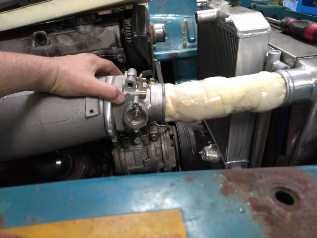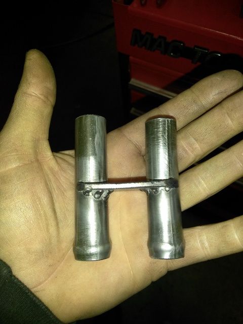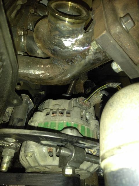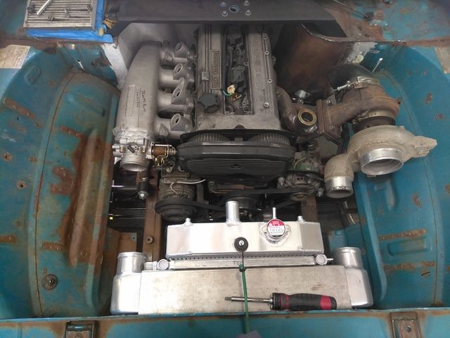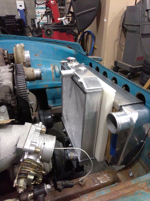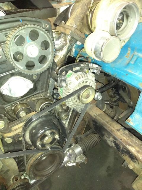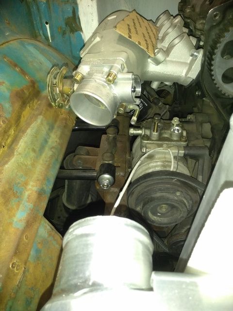 did more work today. after a lot of looking around the junk yard for pieces that fit properly i ended up with a thermostat housing off of a mercury capri XR2 turbo and a water pump outlet from a v6 hyundai sonota. im not using the stock thermostat cause it sticks out the front of the engine like the miatas do which is bad if youre going to be beating on the car. look up "miata coolant reroute" for more info on that.