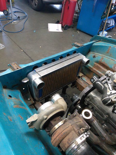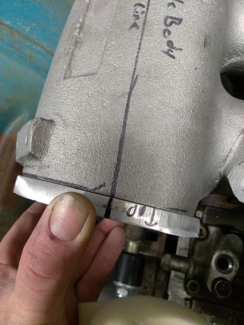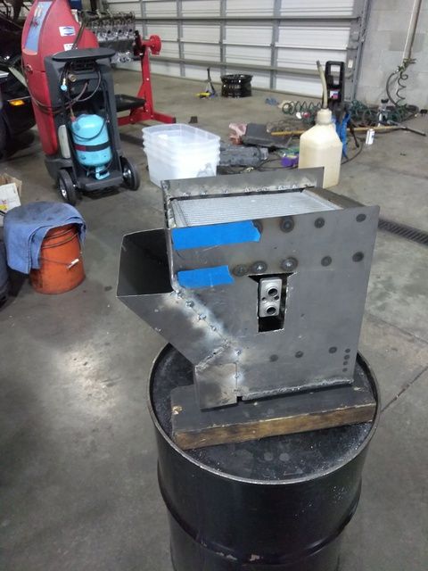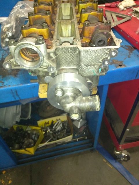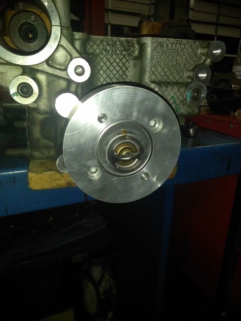 the water pump inlet bolts right up, i just need to drill, tap, and put a hose barb in it for the heater core. the thermostat housing needs to sit on top of a plate so i have some where to drill and tap for a barb for the other side of the heater core. that will get done after i have the heater core plumbed into the engine bay. i made teh plate out of some 4" aluminum bar stock i have at my work for making misc tools. im still not great on the lathe but im slowly learning.