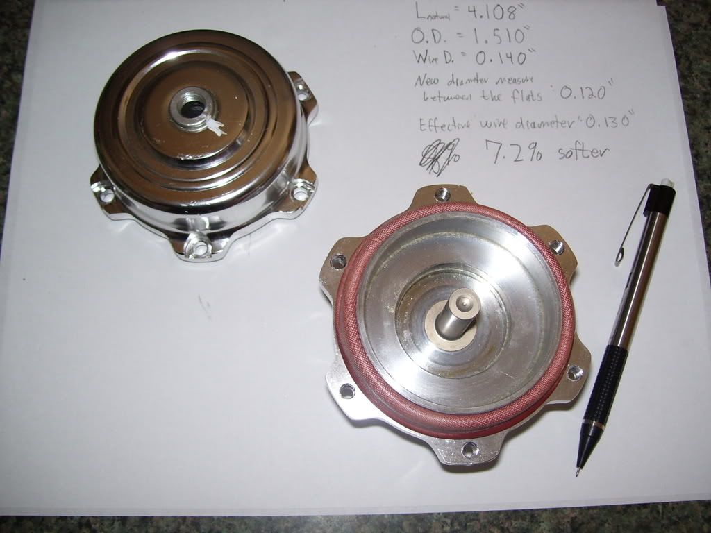 When you install the spring, it gets compressed to about 2.00" long. When the valve opens, it gets compressed to about 1.50" long. Let's ASSume that the k value for my stock spring is 42 lbs/in. This is only an approximation, but a few different derivations based on other info suggest this number is correct.